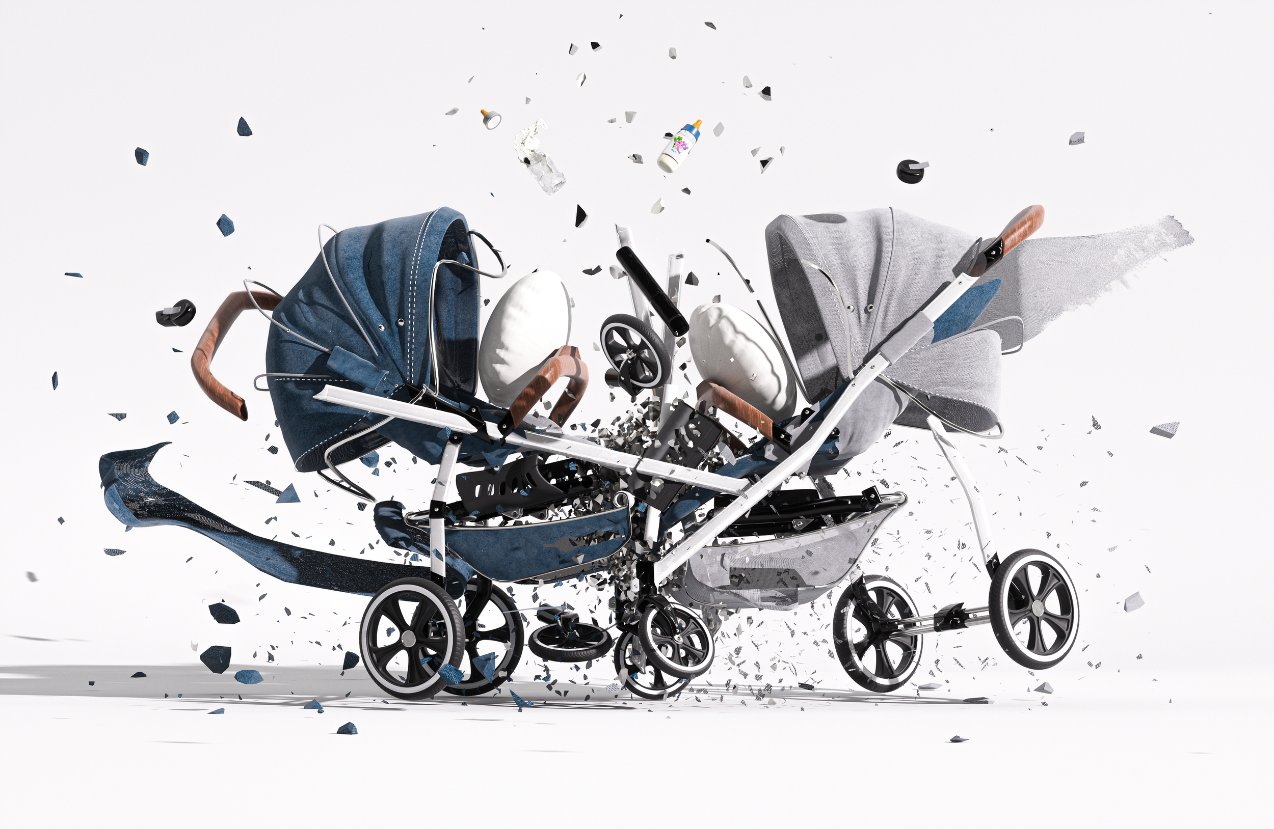 Inspired by the famous slogan “Don't Drink and Drive,” the work transforms the absurd into metaphor: an accident between two strollers.